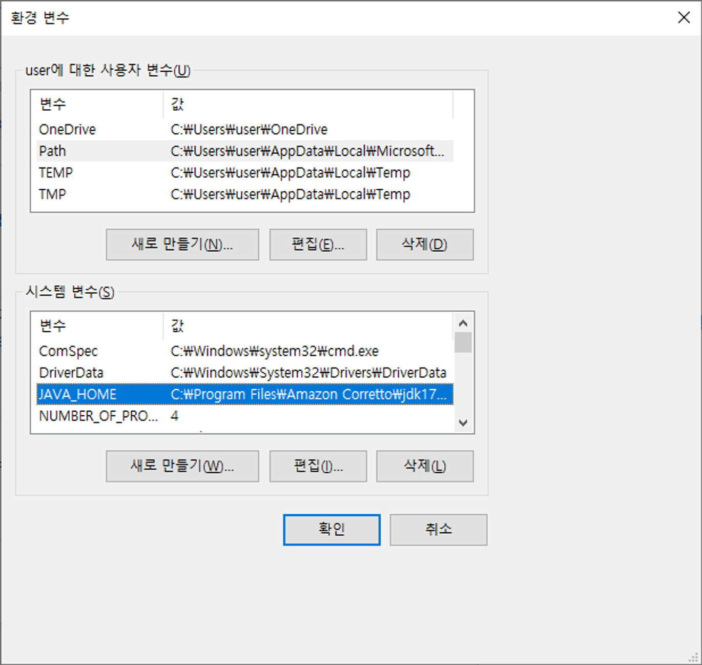 시스템 변수에 JAVA_HOME 이라는 변수가 추가된 것을 확인할 수 있습니다.